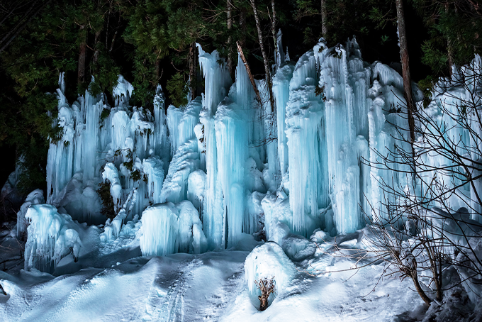 這種該景觀是將衹有在深山中才能看到的現象再現在福地溫泉,將溪流中的水噴在溫泉街的樹上形成的。在被藍色冰柱圍繞的雪中漫步非常夢幻,當地的舞獅表演“Henbetori”非常值得一看!在特殊活動中還會邀請客人品嘗米酒。